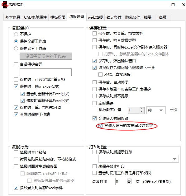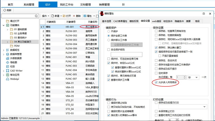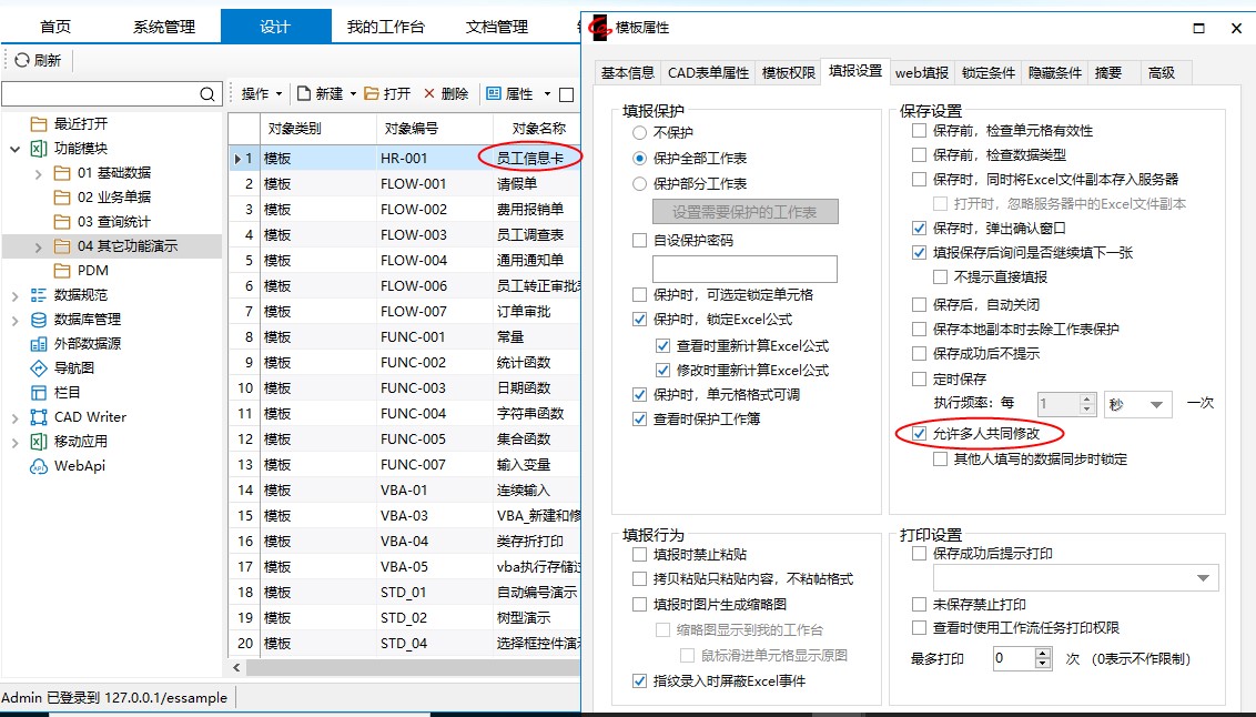 打开需要多人共同修改的同一表单模板(如“员工信息卡”)属性窗口,勾选“允许多人共同修改”: