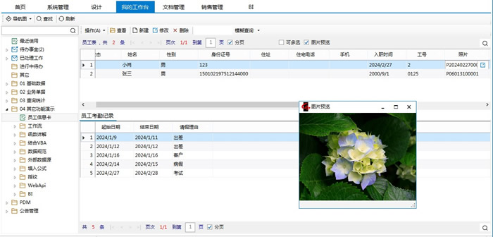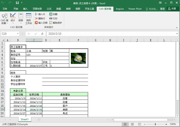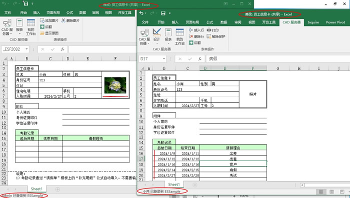 完成设置后,客户端用户“小肖”和“admin”同时修改小肖的信息卡:小肖添加考勤明细;admin添加照片