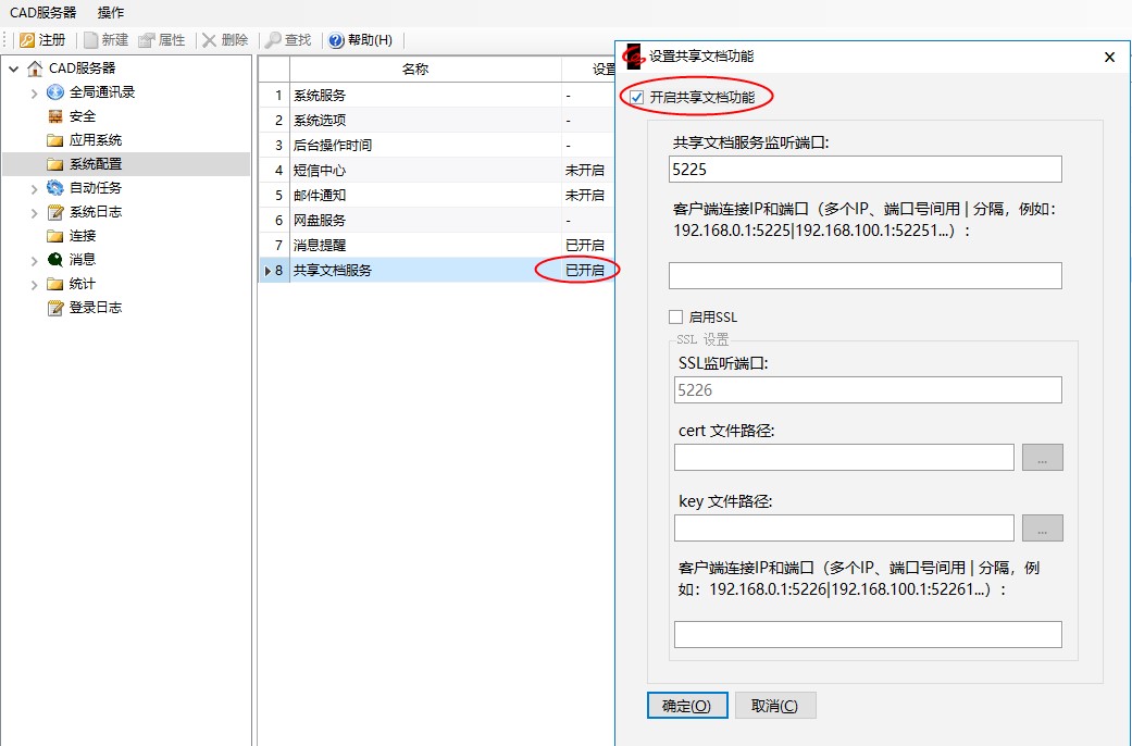 前提条件:系统管理台共享文档服务为开启状态(服务监控端口,默认5225)。如果启动SSL,就可使用cert和key文件。
