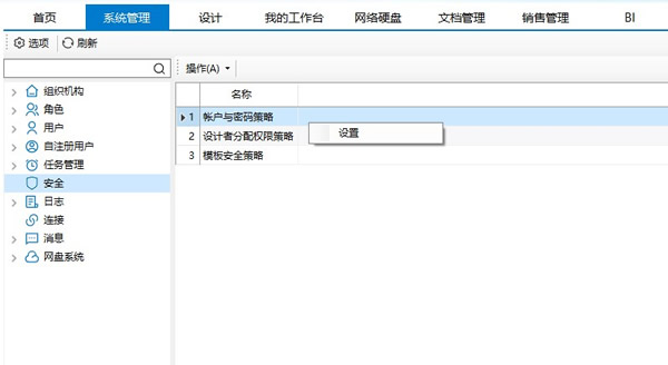 - 在系统管理栏目左侧选中“安全”,右侧选中“设计者分配权限策略”,右击鼠标,选择弹出菜单【设置】。
