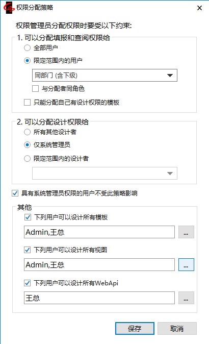 通常在一个组织中,拥有设计者(Report Designer)权限的用户可能不只一个,他们往往分属于不同的部门,各自负责本部门所用模板的设计。模板的填报和查阅权限的分配是由模板设计者决定的。某些情况下,对于设计者分配模板权限的行为需要作一定的限定,比如说,财务部经理是设计者,她负责设计财务部所用的所有模板,但是她只能把这些模板的权限分配给财务部的用户,不能分配给财务部以外的用户,诸如此类的限制,需要通过设置“设计者分配权限策略”来实现。具体操作方法如下: