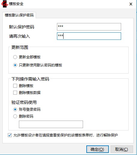 在“更新范围”那里,选择“只更新使用默认密码的模板”,则如果用户曾经对某个模板A,在其模板属性窗口上单独设置过保护密码,则填报模板A时,依然用A自己的密码去加保护,不会使用统一密码。选择“更新全部模板”,则不管有哪些模板曾经单独设置过密码,一律作废,填报时统一用这里设置的密码去加保护。